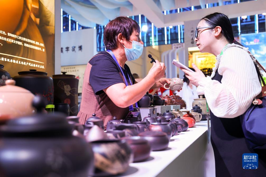8月17日,參展商(左)在陶器燒制技藝展位上推介特色商品。