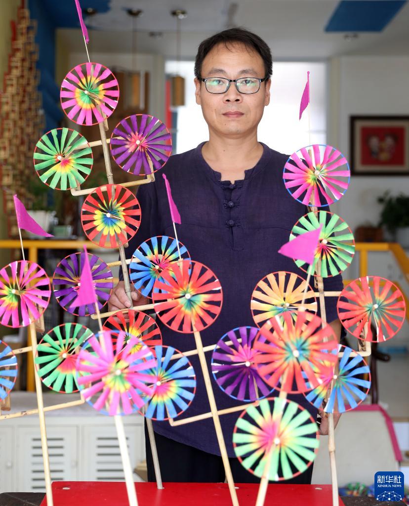 8月17日,崔凱在遼寧省營(yíng)口市自己家中展示他制作的吉祥輪彩紙風(fēng)車(chē)成品。
