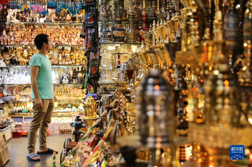 一名男子站在埃及開(kāi)羅哈里里市場(chǎng)夜市的一家工藝品店鋪內(7月28日攝)。