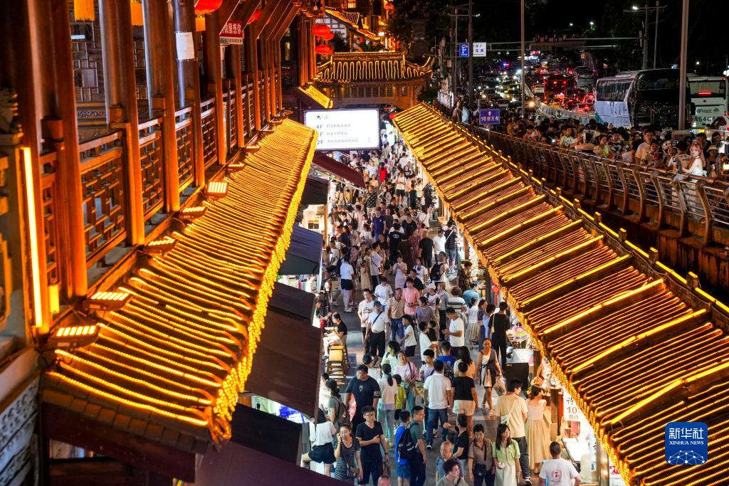 人們聚集在重慶洪崖洞夜市街區(8月3日攝)。