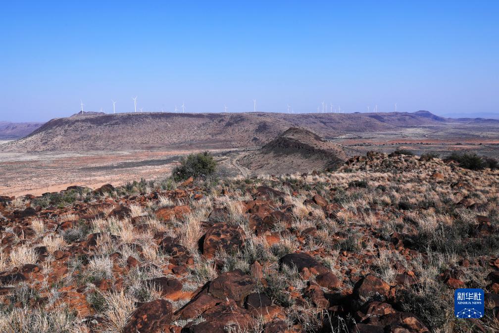 這是8月10日在南非北開(kāi)普省德阿鎮拍攝的龍源南非公司德阿風(fēng)電項目風(fēng)機。