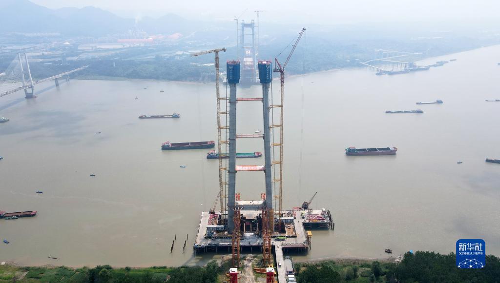 8月18日拍攝的建設中的京臺高速銅陵長(cháng)江公鐵大橋,大橋南北兩座主塔完成封頂(無(wú)人機照片)。