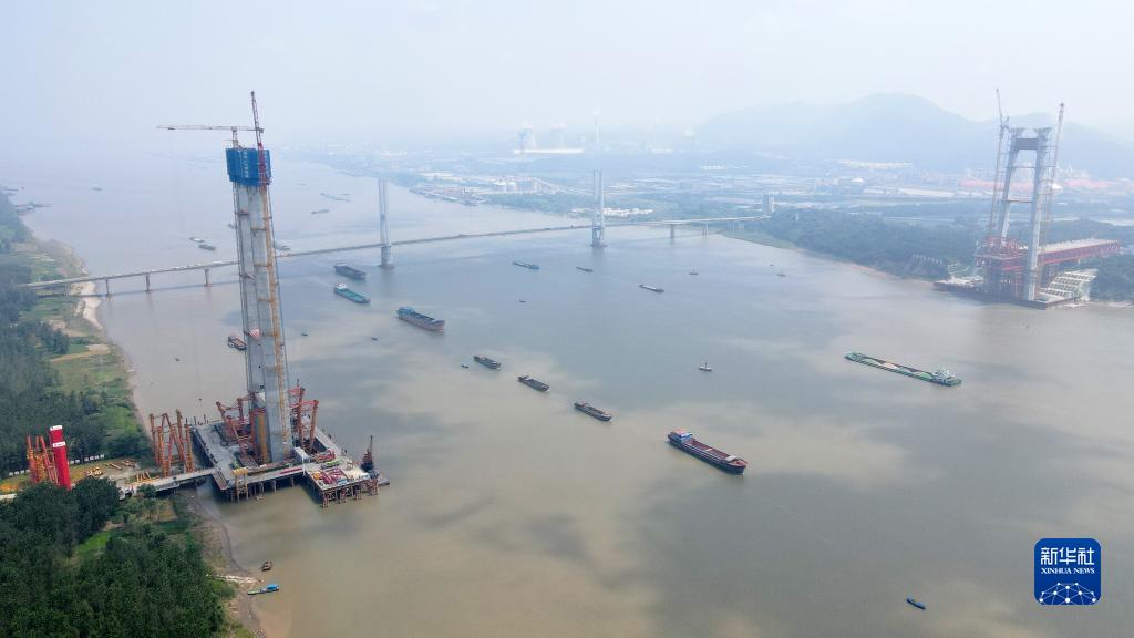 8月18日拍攝的建設中的京臺高速銅陵長(cháng)江公鐵大橋,大橋南北兩座主塔完成封頂(無(wú)人機照片)。