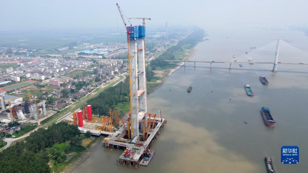 8月18日拍攝的封頂完成的京臺高速銅陵長(cháng)江公鐵大橋3號主塔(無(wú)人機照片)。