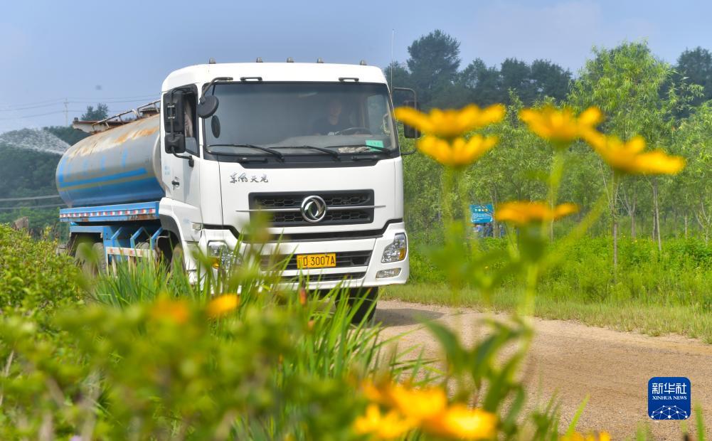 8月17日,工作人員駕駛灑水車(chē)在西露天礦內給苗木澆水。