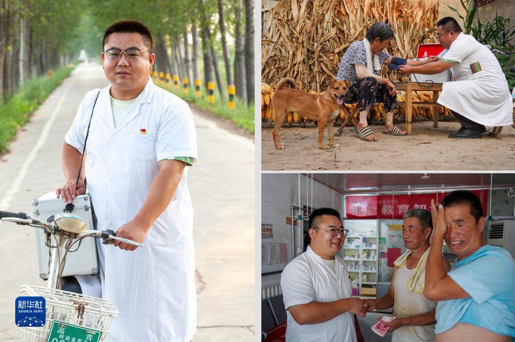 這是山東省淄博市高青縣黑里寨鎮的鄉村醫生張春輝,從醫22年(拼版照片,均為8月17日攝)。左圖為張春輝在山東省淄博市高青縣黑里寨鎮的巡診路上留影;右上圖為張春輝(右)在山東省淄博市高青縣黑里寨鎮為村民測量血壓;右下圖為村民向張春輝(左一)歸還住院墊付的借款時(shí)激動(dòng)流淚。