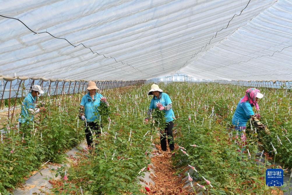 8月17日,農民在吉林省德惠市朱城子鎮沿河村程雪家庭農場(chǎng)采摘玫瑰花。