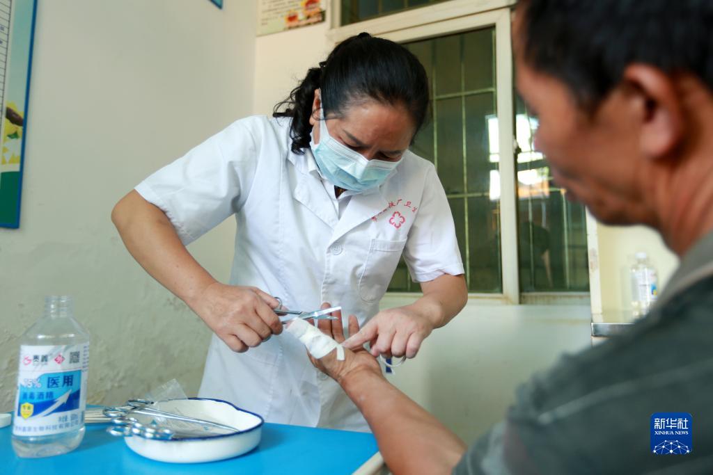 羅海香(左)在村衛生室給村民包扎傷口(8月16日攝)。