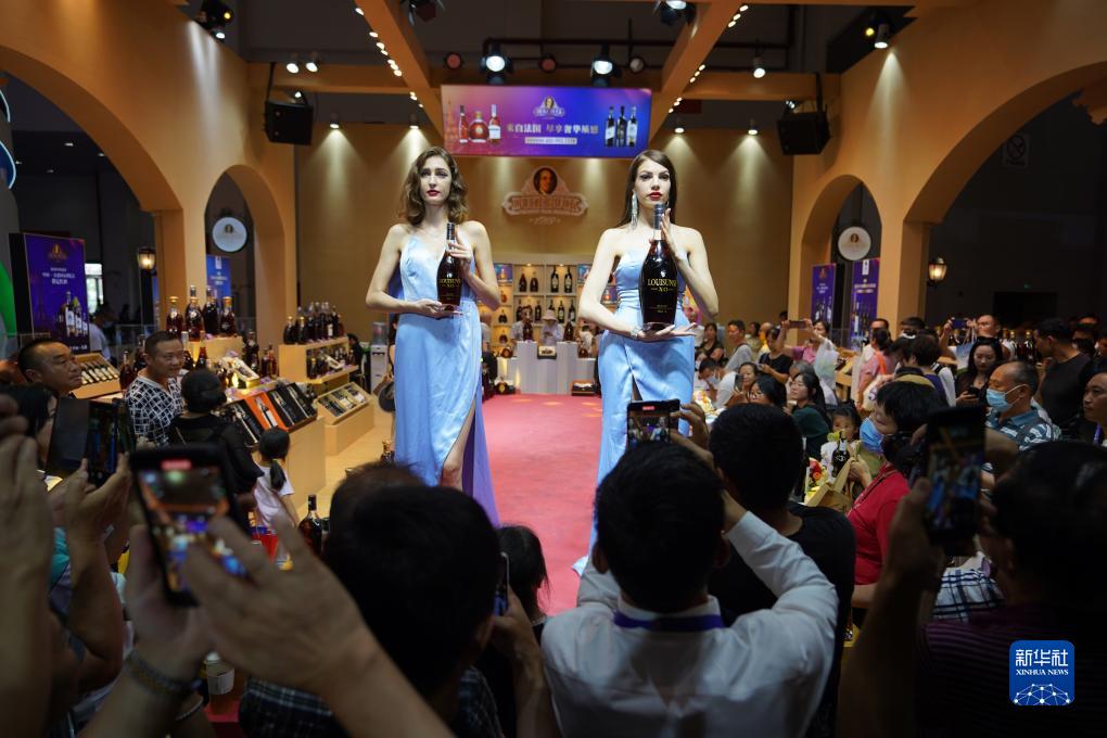 模特在法國展位上展示白蘭地(8月17日攝)。