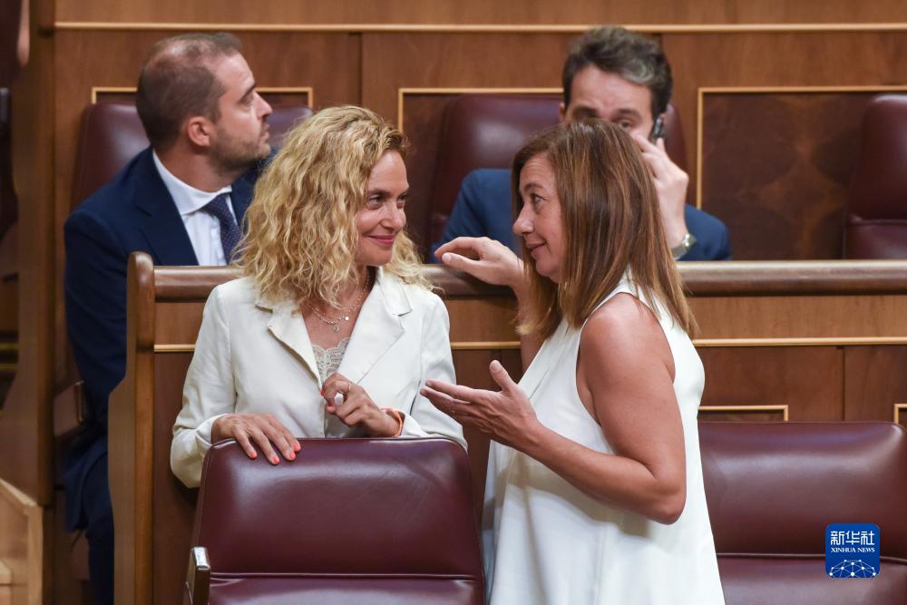8月17日,在西班牙馬德里,西班牙議會(huì )新任議長(cháng)弗朗西娜·阿門(mén)戈爾(右)與前任議長(cháng)梅麗特克塞爾·巴泰特在議會(huì )交談。