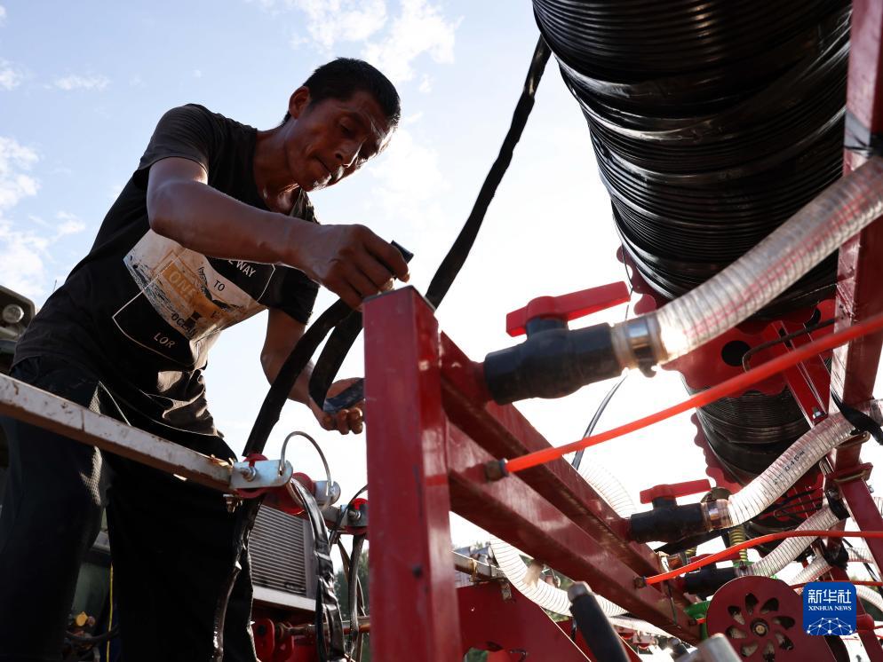 8月18日,在涿州市刁窩鎮潘各莊村,工作人員為播種機安裝滴灌帶。