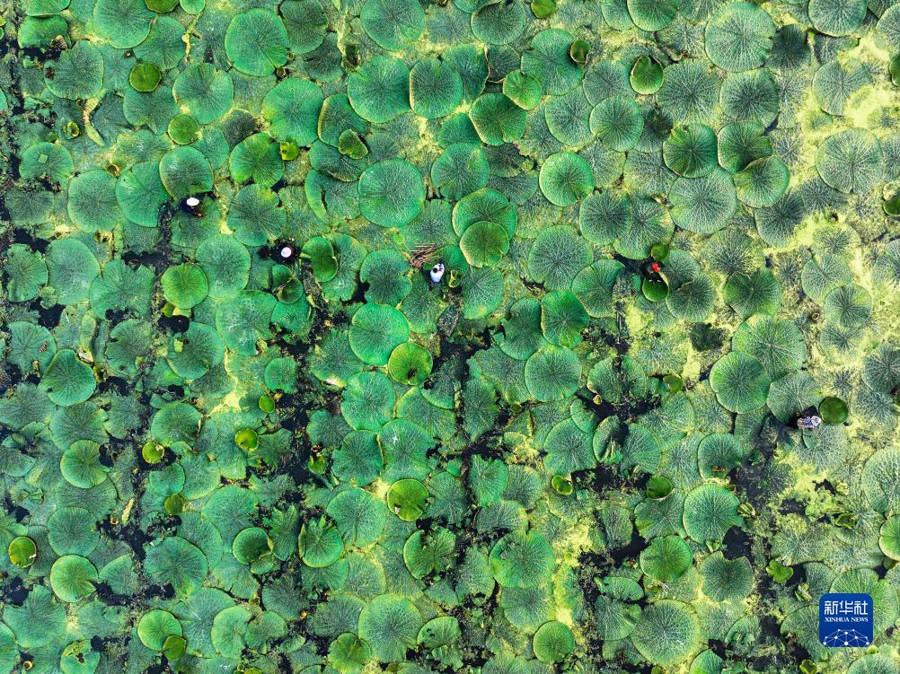 8月18日,泰州市姜堰區申俞村農民在采收芡實(shí)(無(wú)人機照片)。
