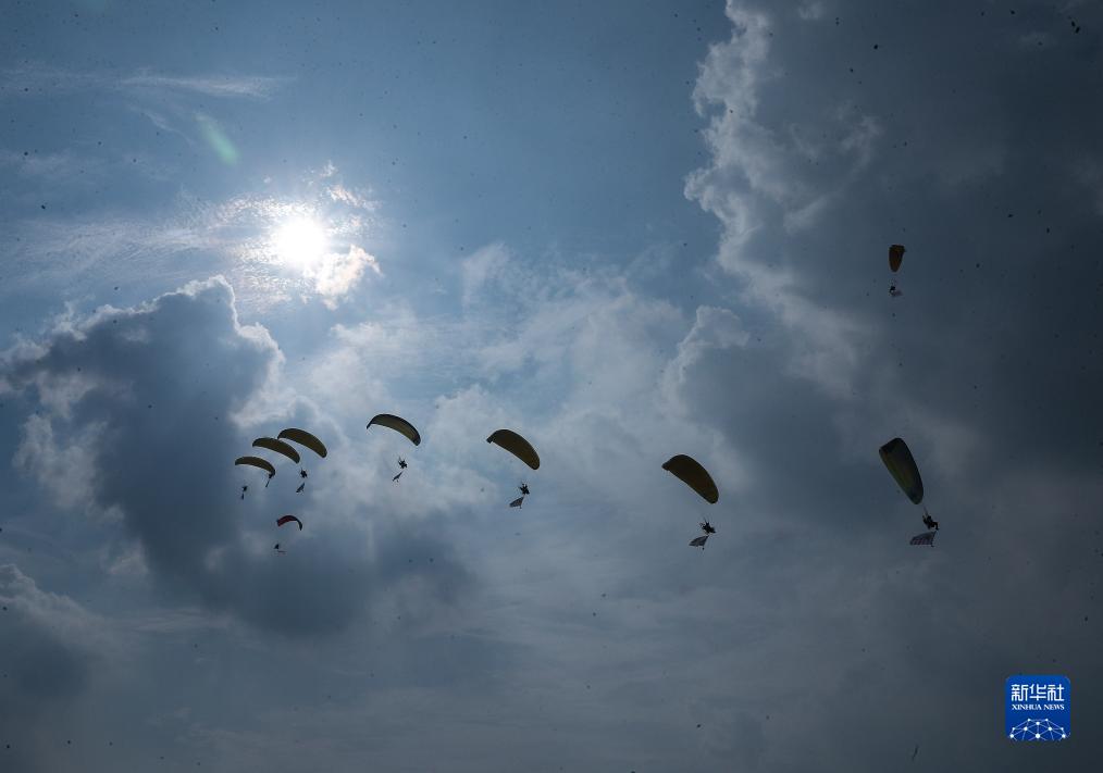 這是8月18日在第十屆沈陽(yáng)法庫國際飛行大會(huì )開(kāi)幕式上拍攝的動(dòng)力傘飛行表演。