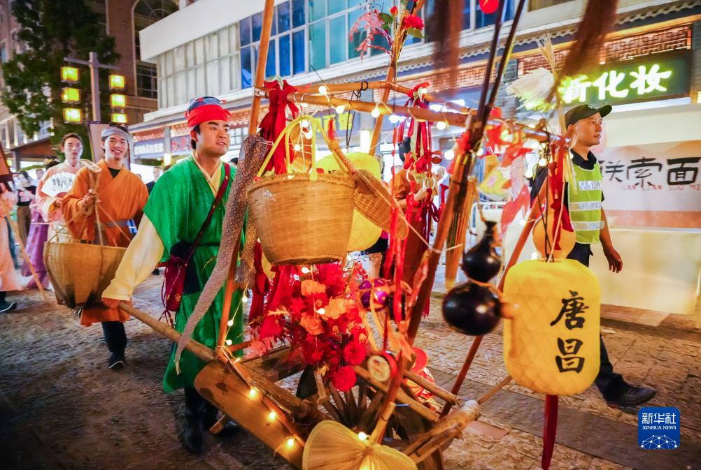 8月18日拍攝的在“唐昌之夜”主題文化節上展示的當地民俗踩街表演。