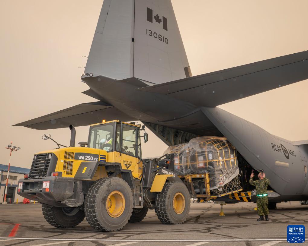 這張加拿大武裝部隊8月14日拍攝的照片顯示一架軍機在耶洛奈夫機場(chǎng)卸載救災物品。