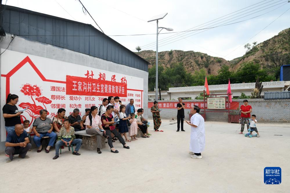 在石樓縣龍交鄉王家溝村,楊興榮(右三)在為村民講解健康知識(8月15日攝)。