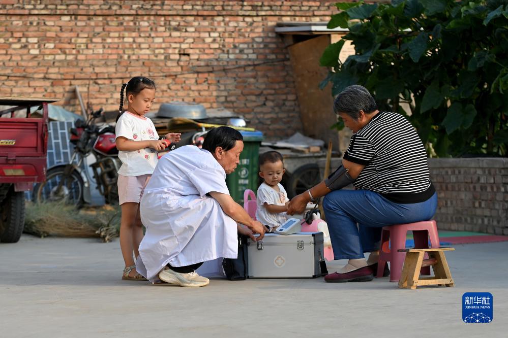 在石樓縣龍交鄉王家溝村,楊興榮(左二)在為村民測量血壓(8月14日攝)。