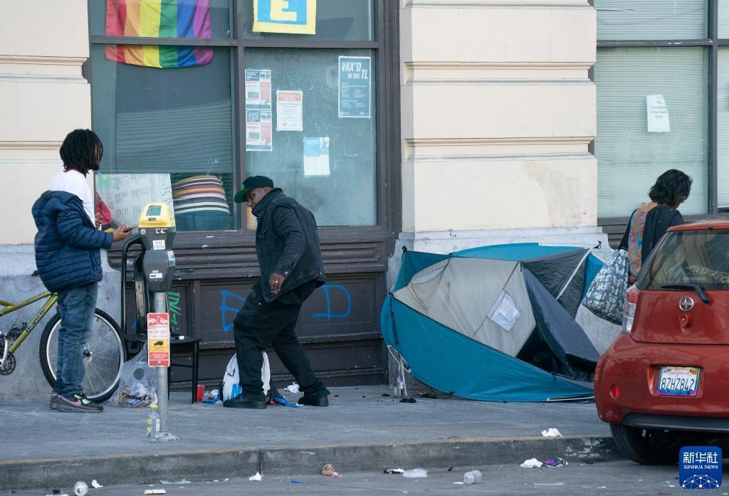 這是8月18日在美國加州舊金山市區的街道上拍攝的無(wú)家可歸者。