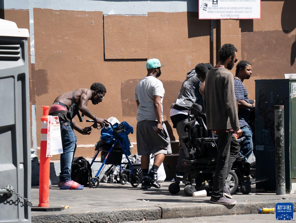 這是8月18日在美國加州舊金山市區的街道上拍攝的無(wú)家可歸者。