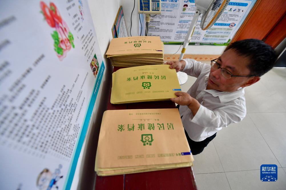 8月16日,肖九林在診所內整理村民的健康檔案。