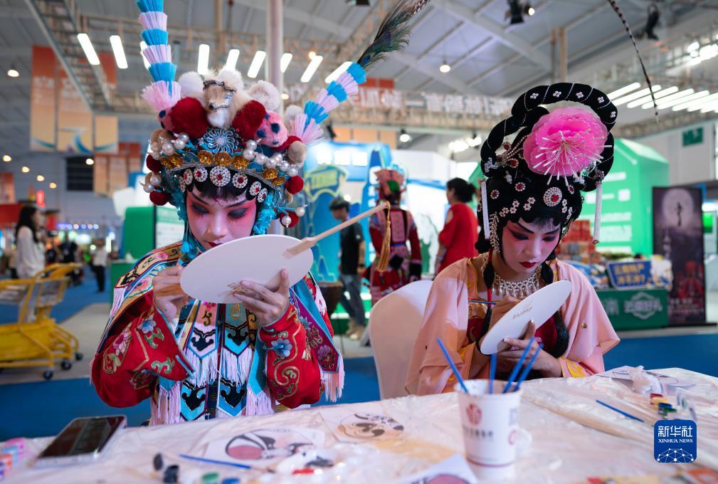 8月16日,在南博會(huì )文化旅游館滇劇展演區,兩名來(lái)自云南省滇劇院的演員在扇子上繪制臉譜。