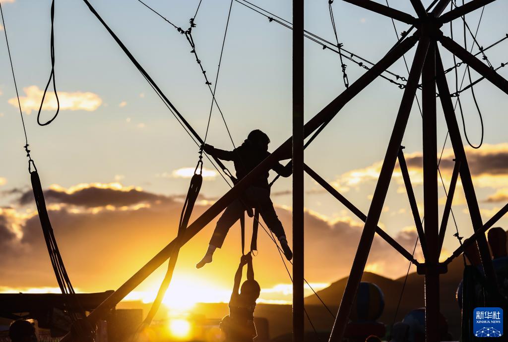 8月18日,在蒙古國泰吉山谷,孩子們在蕩秋千。