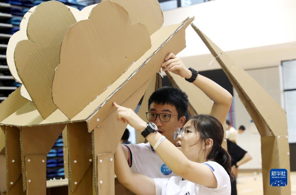 8月20日,來(lái)自上海市市西中學(xué)的學(xué)生在學(xué)生建造節活動(dòng)中搭建參賽作品。