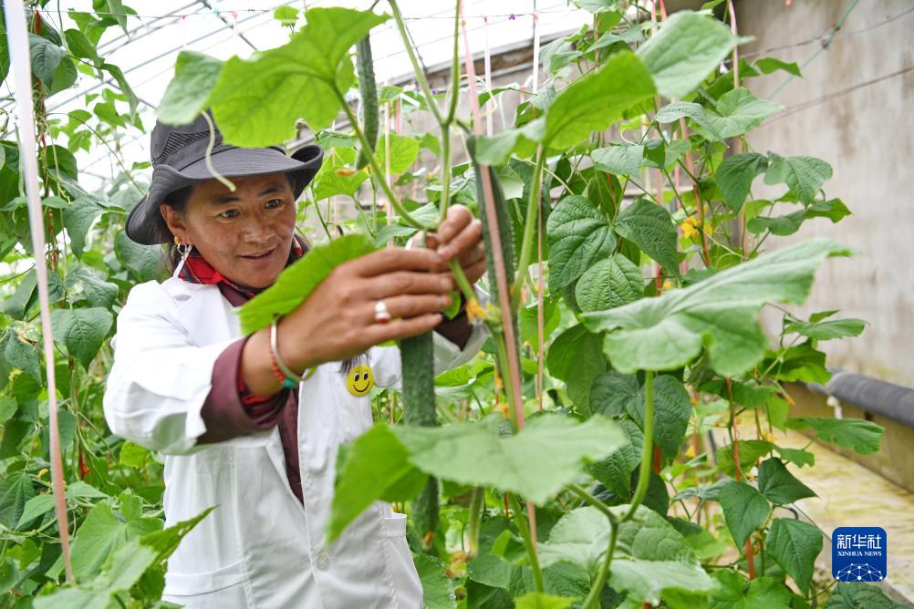 措勤縣高原生態(tài)畜牧業(yè)現代化養殖一體化產(chǎn)業(yè)綜合基地合作社社員白瑪在蔬菜大棚采摘黃瓜(8月19日攝)。