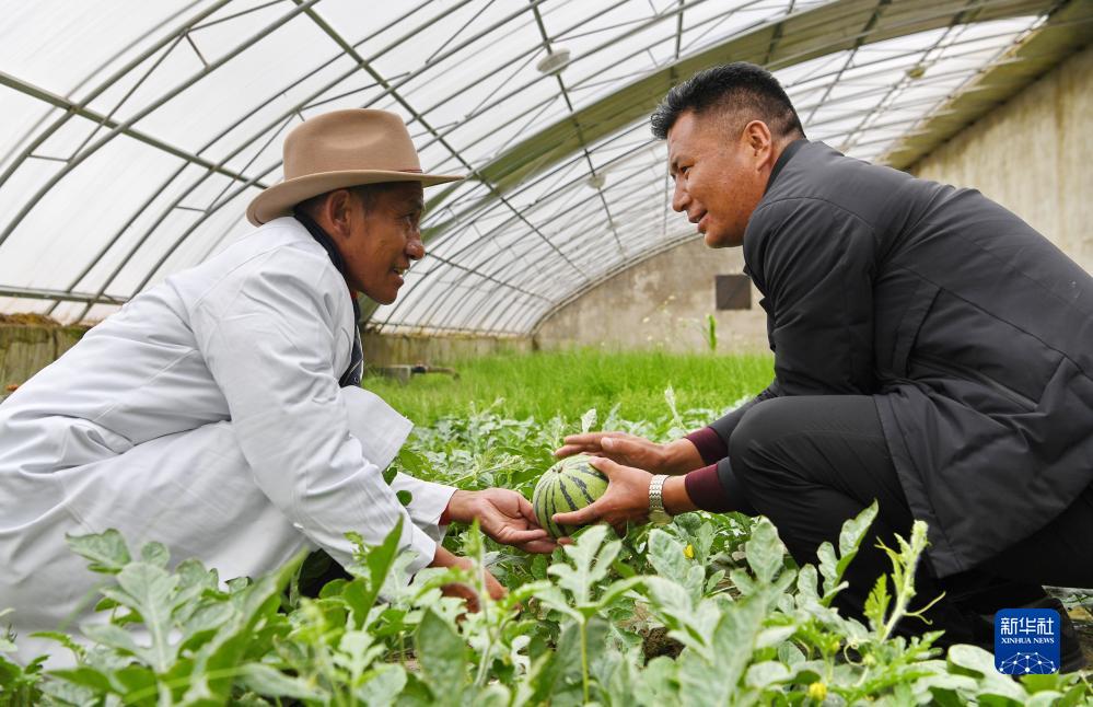 措勤縣農牧業(yè)技術(shù)推廣站站長(cháng)吾金次仁(右)和措勤縣高原生態(tài)畜牧業(yè)現代化養殖一體化產(chǎn)業(yè)綜合基地合作社負責人扎西桑布在西瓜大棚里交流(8月19日攝)。