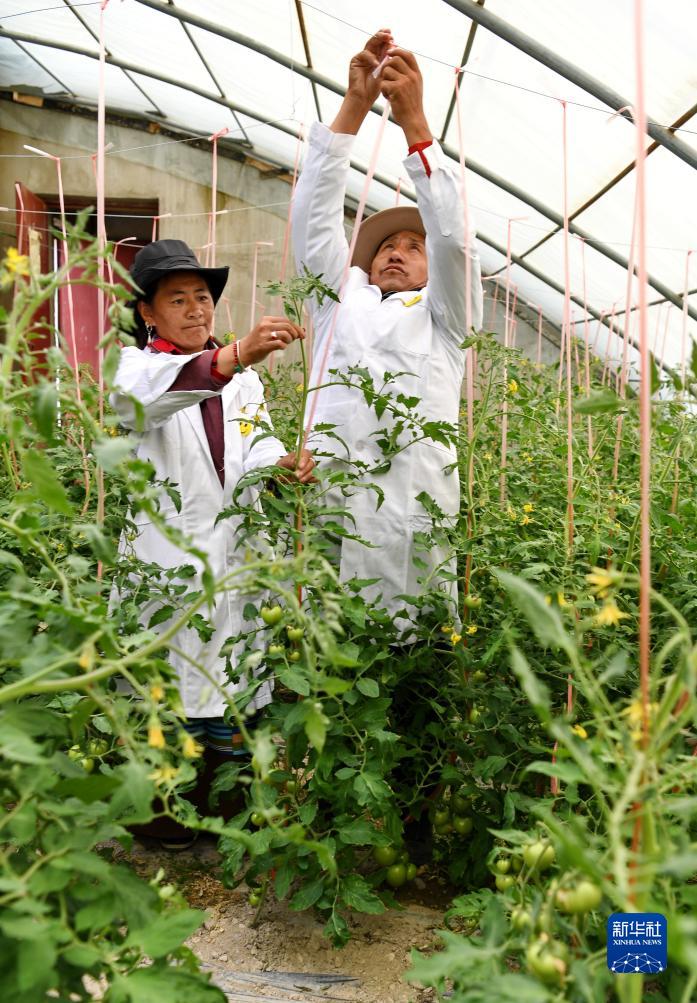 措勤縣高原生態(tài)畜牧業(yè)現代化養殖一體化產(chǎn)業(yè)綜合基地合作社社員在蔬菜大棚為西紅柿吊蔓(8月19日攝)。