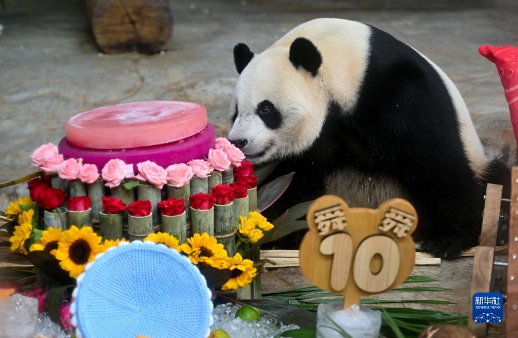 當日,位于??谑械暮D蠠釒б吧鷦?dòng)植物園為園內大熊貓“貢貢”和“舜舜”舉行10歲生日慶?;顒?dòng)。工作人員用冰塊、竹筍、水果等制作生日大餐,為它們慶生。