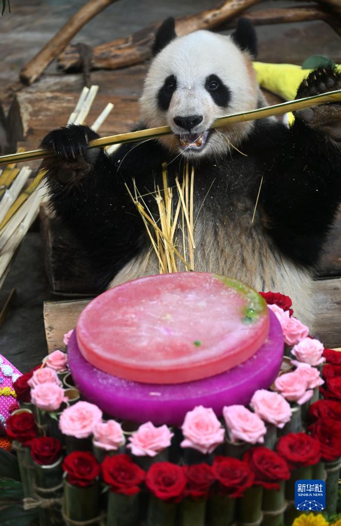 當日,位于??谑械暮D蠠釒б吧鷦?dòng)植物園為園內大熊貓“貢貢”和“舜舜”舉行10歲生日慶?;顒?dòng)。工作人員用冰塊、竹筍、水果等制作生日大餐,為它們慶生。