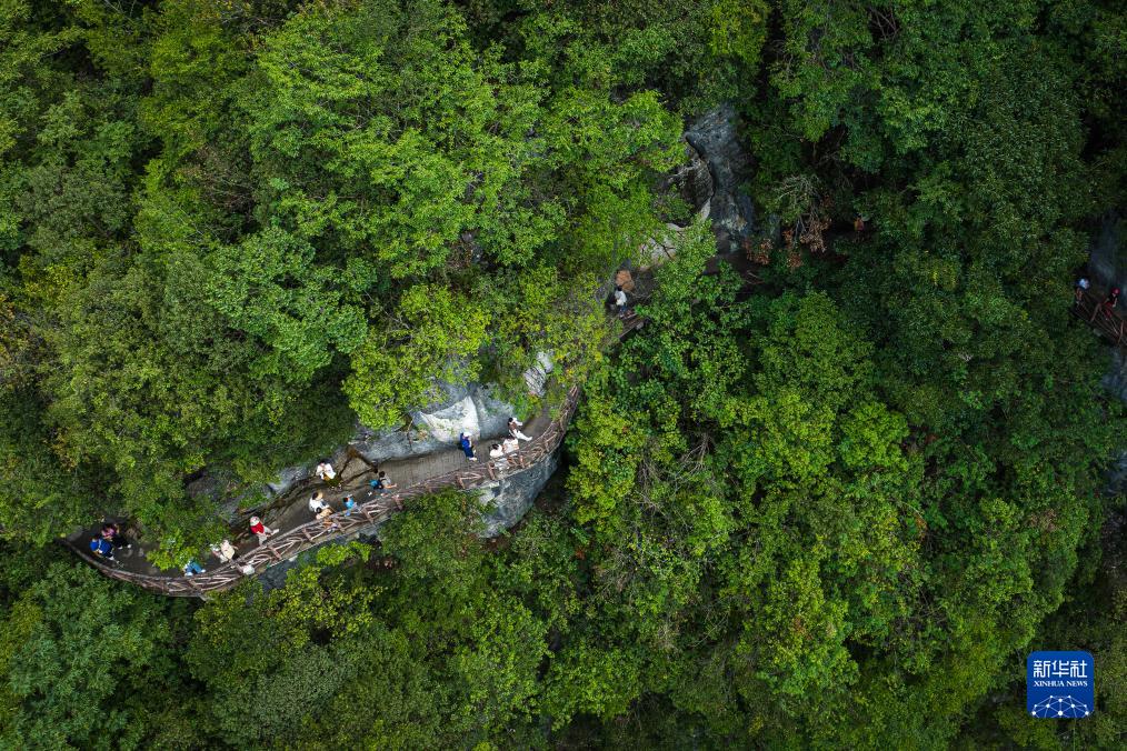 8月20日,游客在湖北省恩施州建始縣地心谷景區游玩(無(wú)人機照片)。
