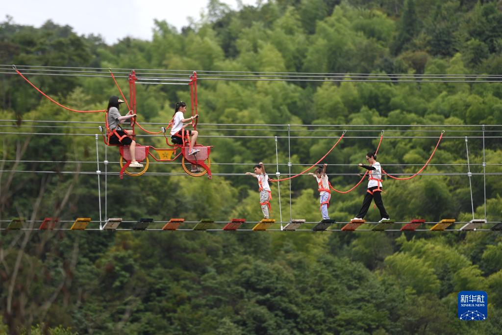 8月20日,游客在余姚市四明山鎮北溪村體驗高空項目。