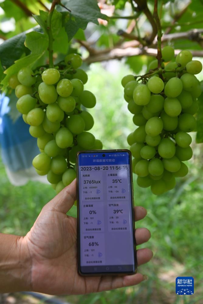 8月20日,在諸暨市姚江鎮浦西村純禾生態(tài)園內,種植戶(hù)何建華展示手機上實(shí)時(shí)顯示的葡萄園各類(lèi)環(huán)境信息。