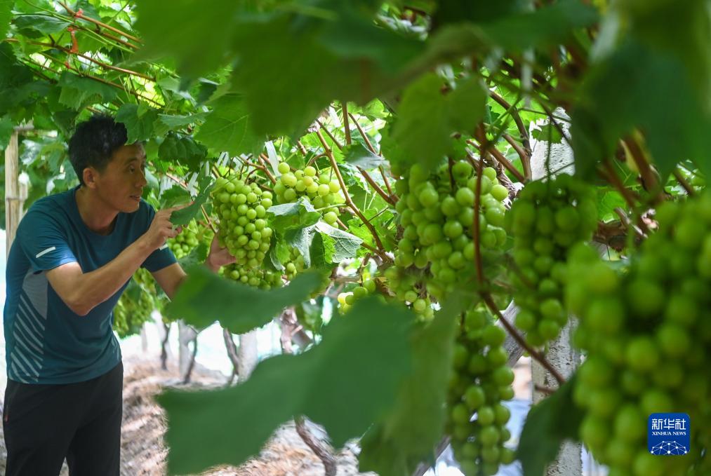8月20日,在諸暨市姚江鎮紫草塢村阿群家庭農場(chǎng)的葡萄大棚內,種植戶(hù)壽怒濤查看葡萄的成熟度。壽怒濤通過(guò)農技培訓學(xué)習葡萄種植新技術(shù),提高葡萄的口感和產(chǎn)量。