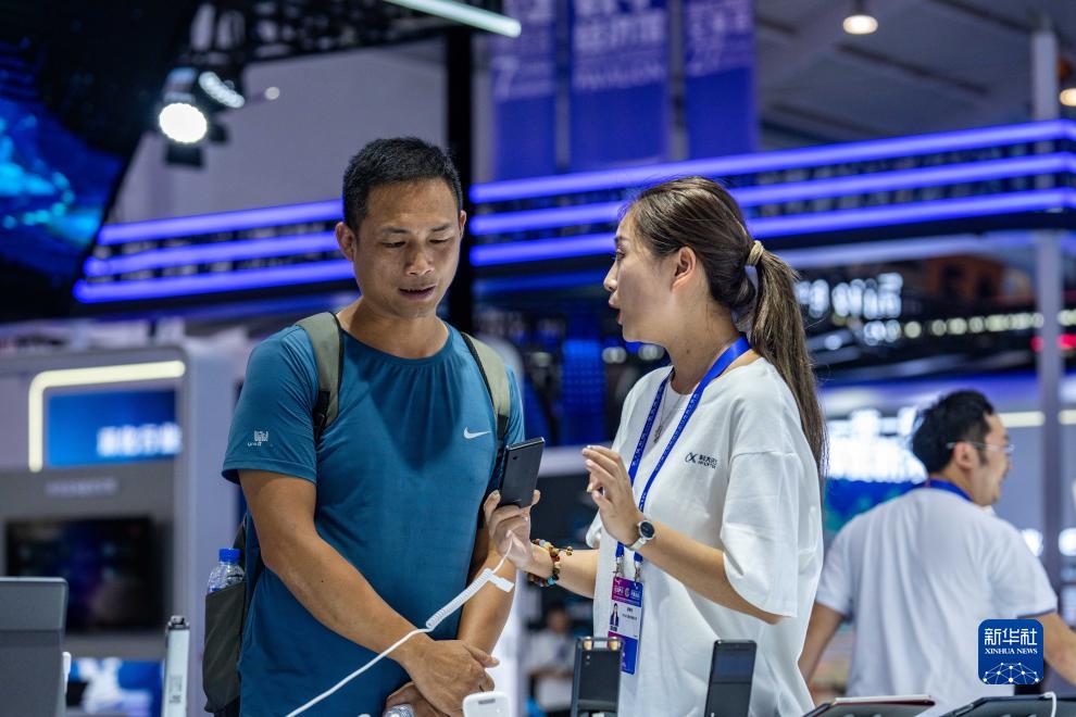 8月16日,客商(左)在第七屆中國—南亞博覽會(huì )科大訊飛展區了解翻譯設備。
