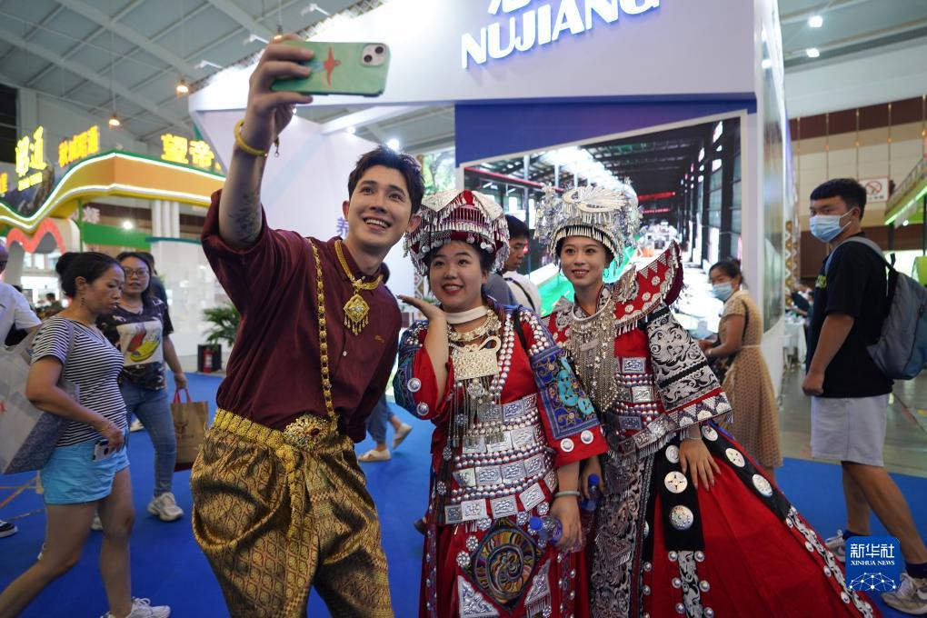身著(zhù)民族服裝的年輕人在第七屆中國—南亞博覽會(huì )上拍照留念(8月17日攝)。