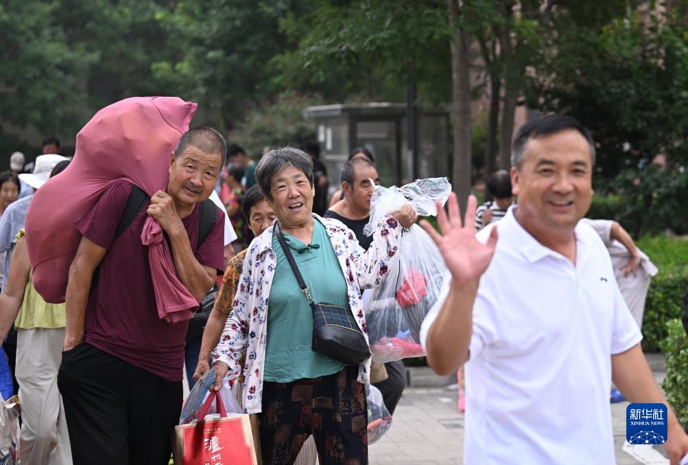 8月20日,在天津市西青區赤龍南街道一臨時(shí)安置點(diǎn),村民收拾行李準備回家。