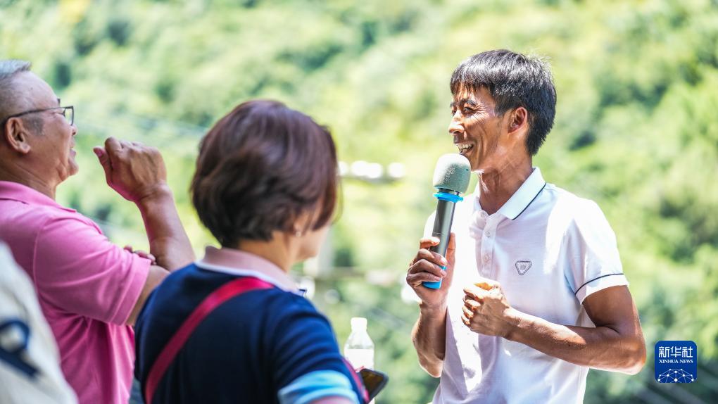 馬選軍在向外地游客介紹北盤(pán)江大橋和家鄉的變化(8月16日攝)。