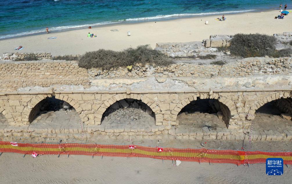 這是8月20日在以色列城市凱撒里亞拍攝的古羅馬渡槽遺址(無(wú)人機照片)。