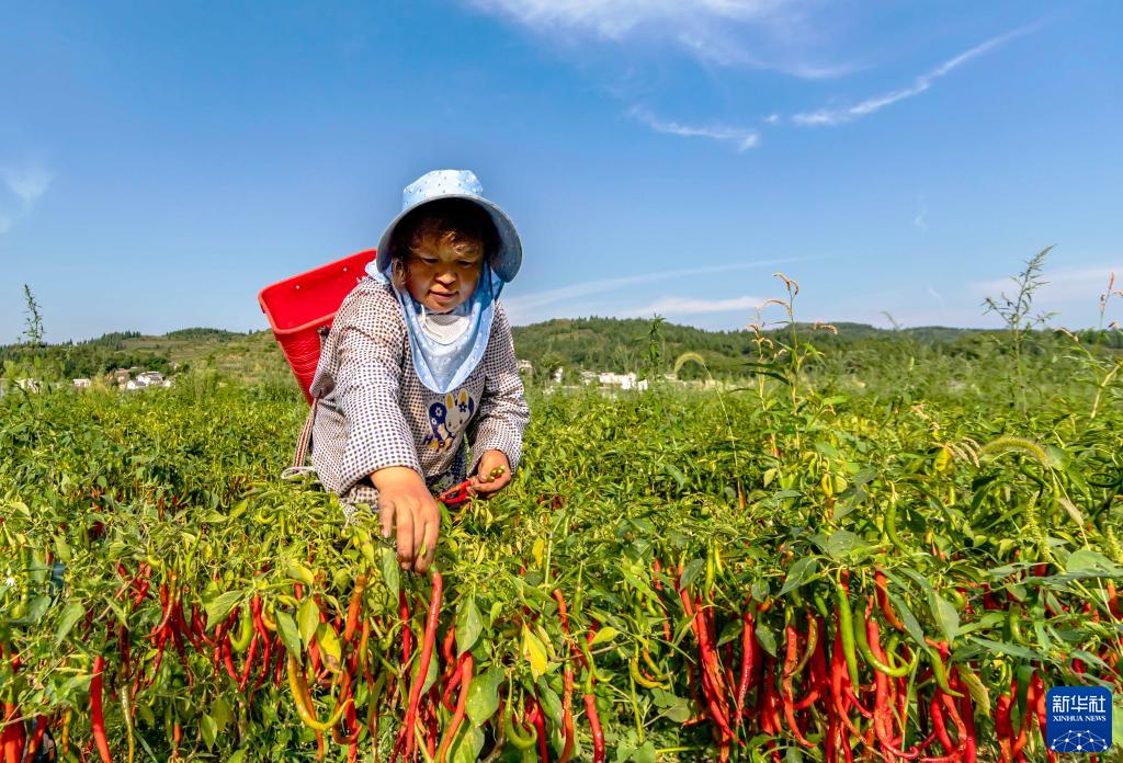 村民在貴州省黔西市林泉鎮營(yíng)腳村采摘辣椒(8月20日攝)。