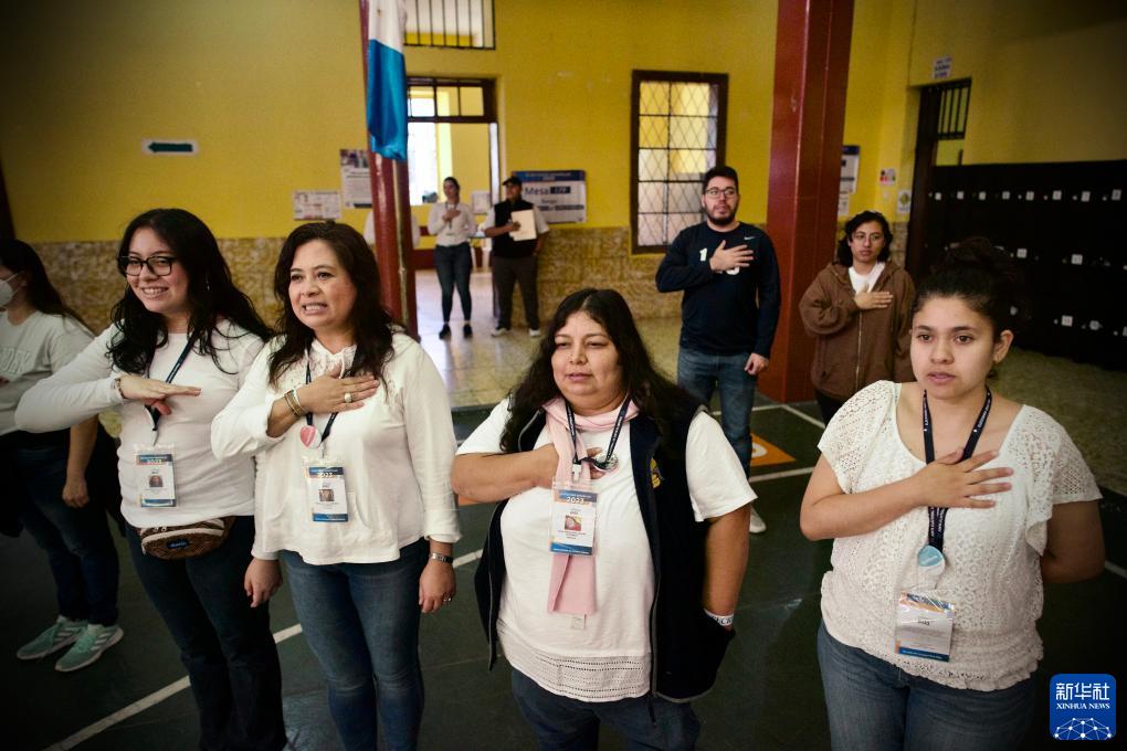 8月20日,在危地馬拉首都危地馬拉城一處投票站,工作人員在投票開(kāi)始前唱國歌。