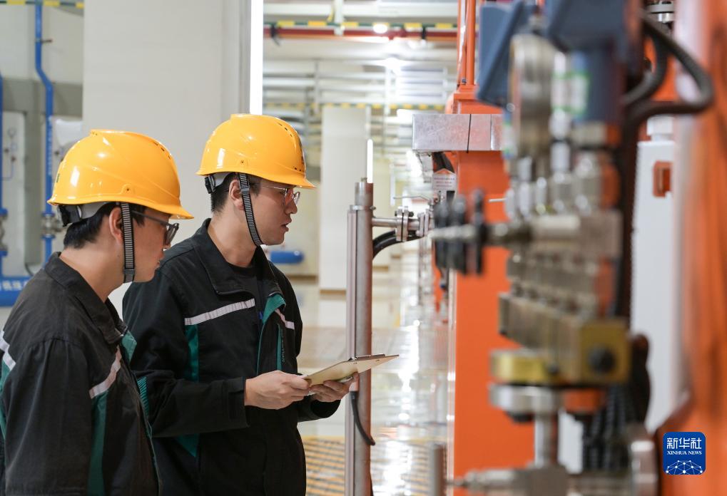 在河北承德的國網(wǎng)新源豐寧抽水蓄能電站地下廠(chǎng)房?jì)?,工作人員對設備進(jìn)行巡檢(8月19日攝) 。