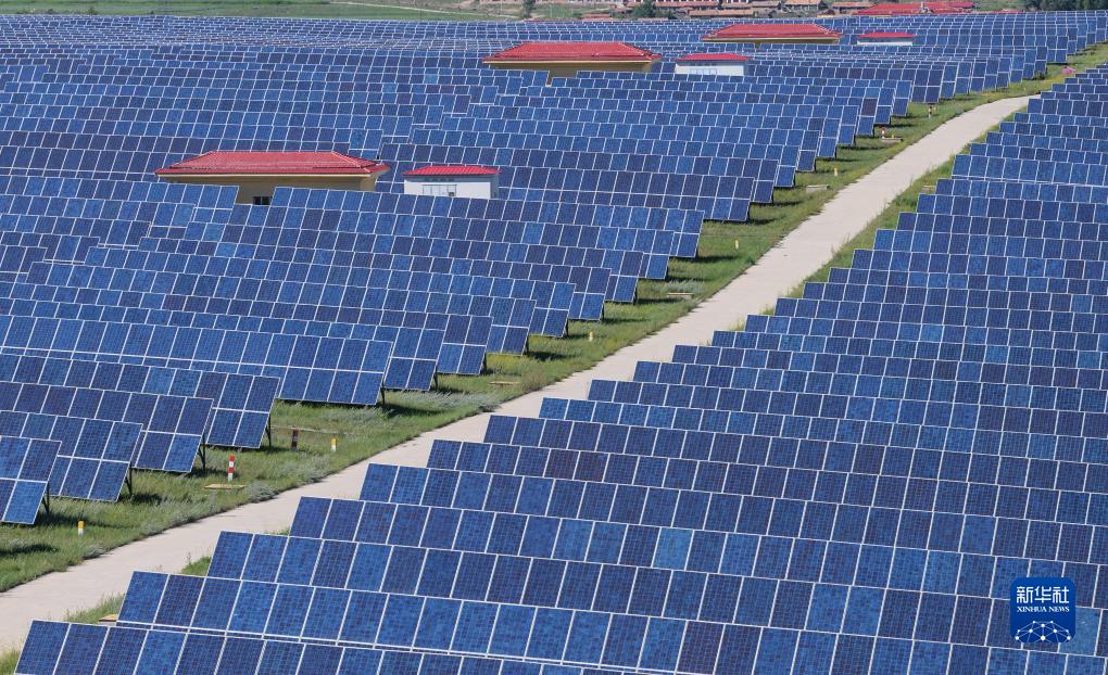光伏板整齊排列在位于河北張家口的國家級可再生能源示范區內(8月18日攝)。由國網(wǎng)冀北電力建設運營(yíng)的國家風(fēng)光儲輸示范工程將當地豐富的風(fēng)能、太陽(yáng)能轉化為綠色清潔的電能。