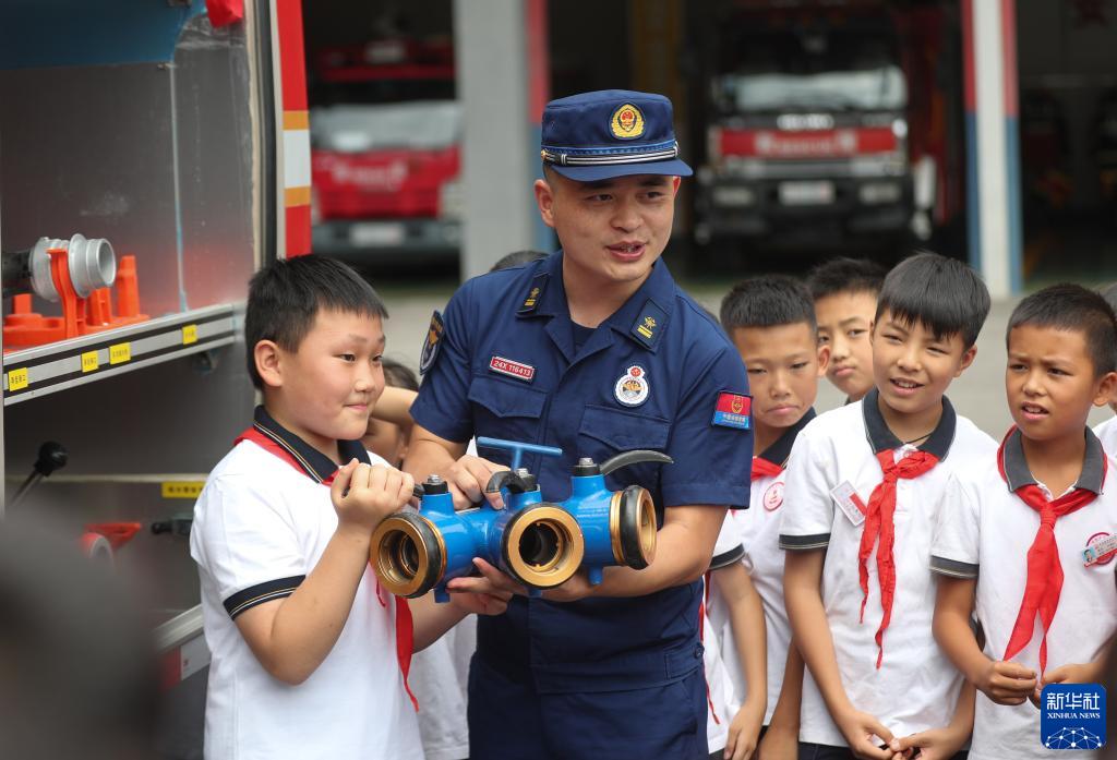 8月21日,貴州省貴陽(yáng)市開(kāi)陽(yáng)縣消防救援大隊消防員指導學(xué)生體驗消防器材裝備。