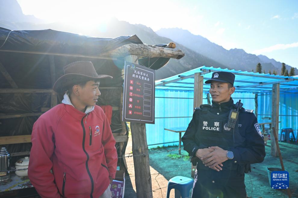 民警李俊杰(右)對夏塔景區馬隊經(jīng)營(yíng)人員進(jìn)行安全提醒(8月19日攝)。