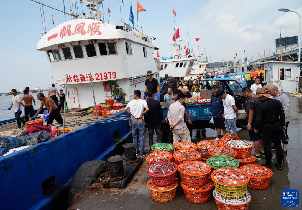 8月16日,漁運船將一筐筐新鮮梭子蟹運到浙江省舟山市普陀區舟山國際水產(chǎn)城碼頭。
