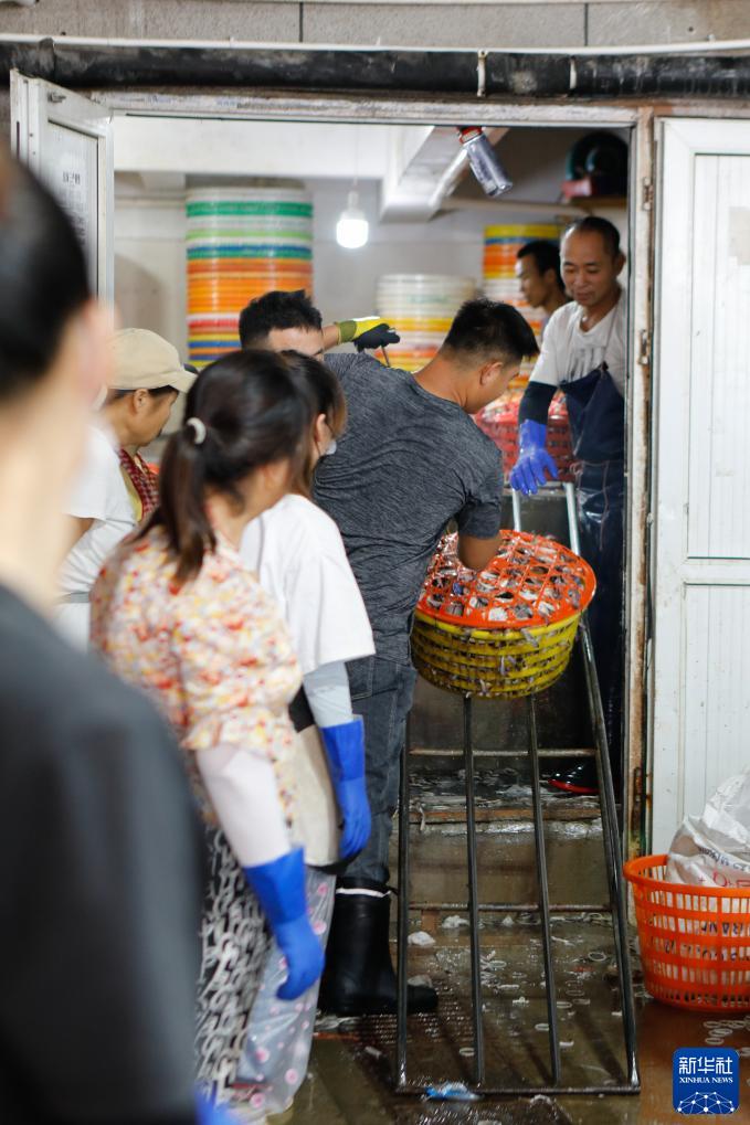 8月16日,商戶(hù)在浙江省舟山市普陀區舟山國際水產(chǎn)城搬運梭子蟹。新華社記者 劉夢(mèng)琪 攝