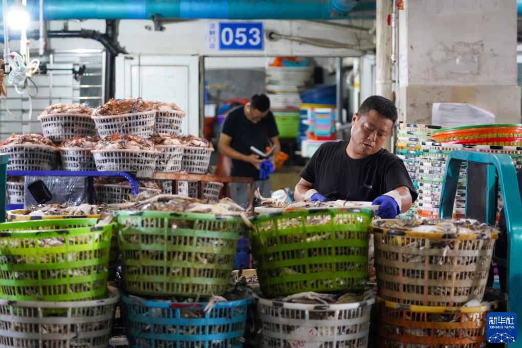 8月20日,在浙江省舟山市普陀區舟山國際水產(chǎn)城,工人將分揀好的梭子蟹裝車(chē)。新華社發(fā)(鄒訓永 攝)